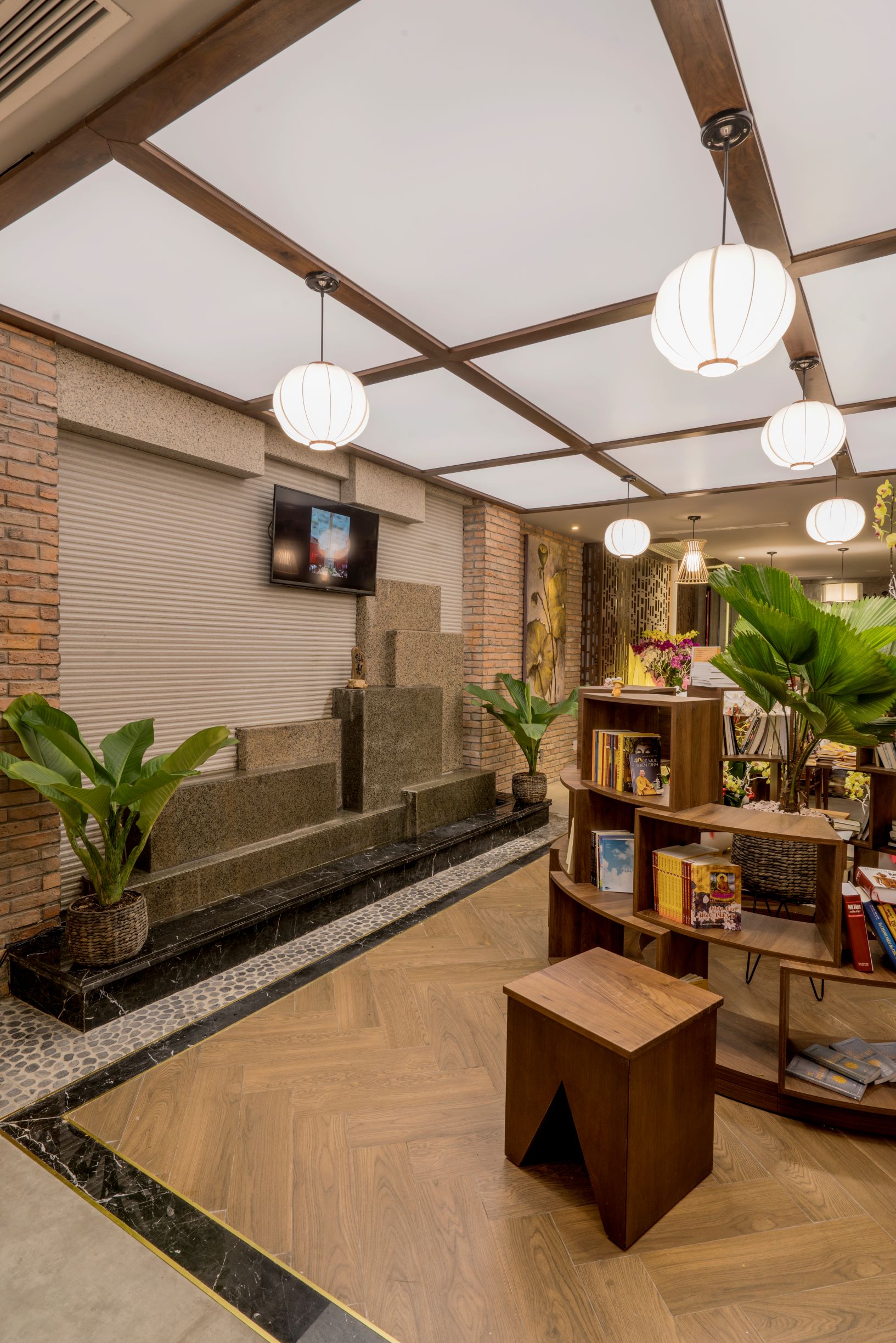 Để thể hiện ý đồ của chủ nhân: bên cạnh việc phục vụ thức ăn, nhà hàng còn là nơi giao lưu văn hóa và lan tỏa tâm an, một không gian đọc sách trong nhà hàng chay được thiết kế và thi công, lồng ghép hài hòa với tổng thể chung của cả công trình.